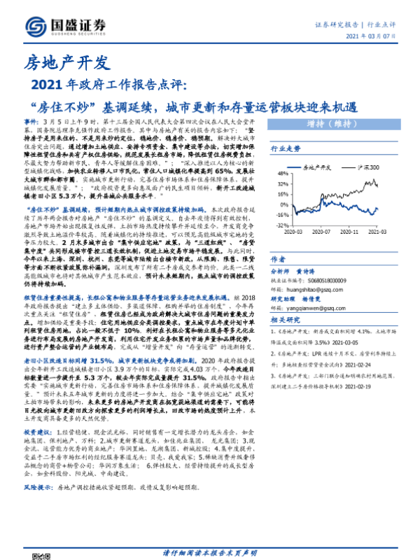【国盛证券】【20210307】2021年政府工作报告点评:‘房住不炒’基调延续,城市更新和存量运营板块迎来机遇-2页 行业研究