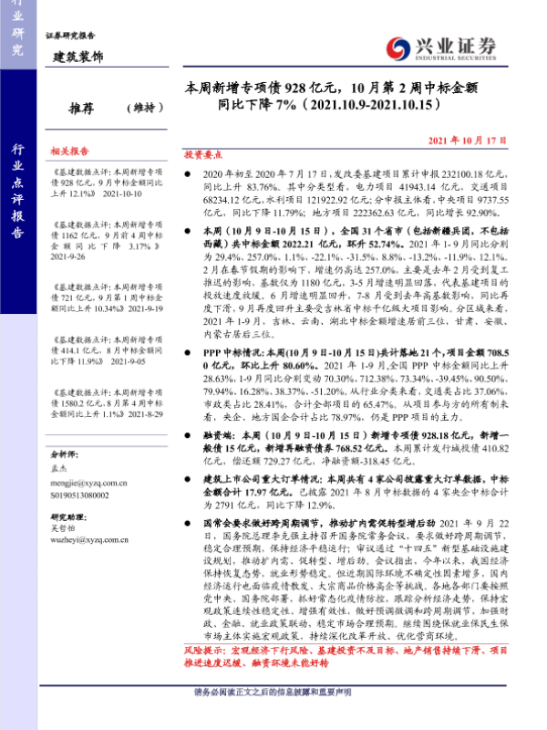 【兴业证券】【20211017】本周新增专项债928亿元,10月第2周中标金额同比下降7%-28页 行业研究