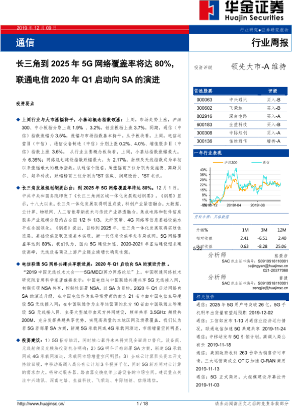 【华金证券】【20191209】通信行业周报:长三角到2025年5G网络覆盖率将达80%,联通电信2020年Q1启动向SA的演进-18页 行业研究
