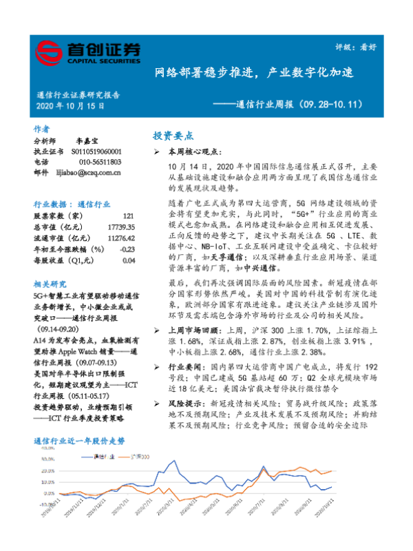 【首创证券】【20201015】20201015-首创证券-通信行业周报:网络部署稳步推进,产业数字化加速-9页 行业研究