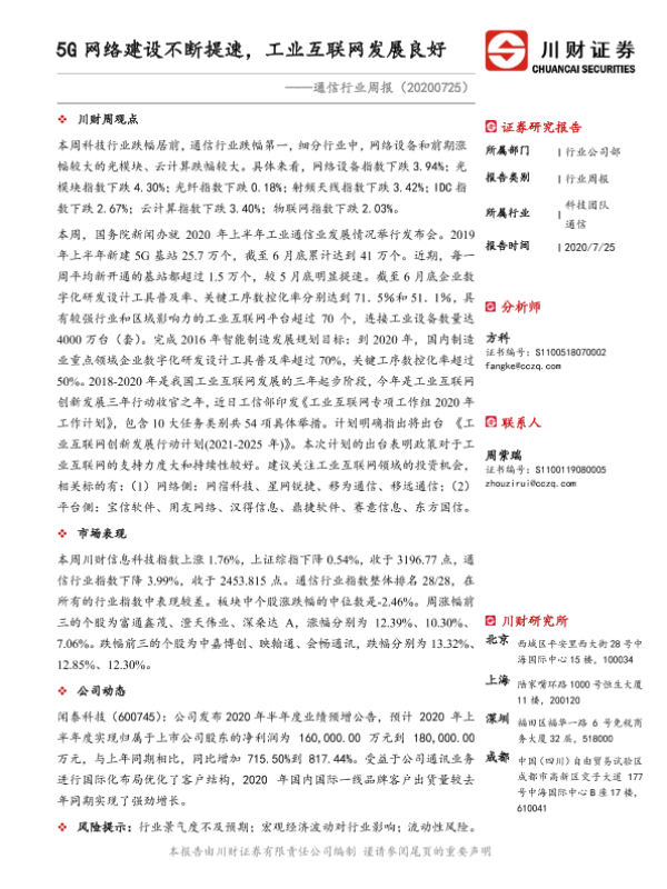 【川财证券】【20200725】通信行业周报:5G网络建设不断提速,工业互联网发展良好-10页 行业研究