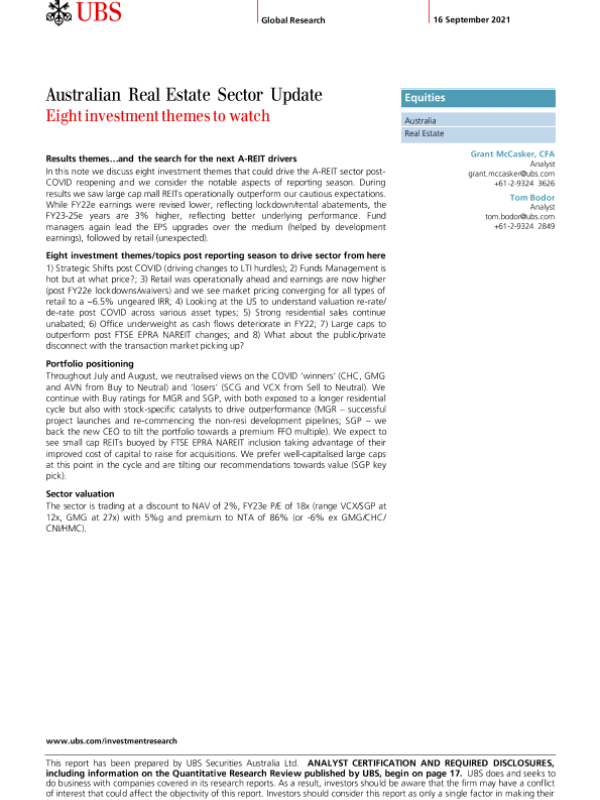 【UBS Securities Australia Ltd.】【20210916】澳大利亚房地产:八个值得关注的投资主题-26页 行业研究