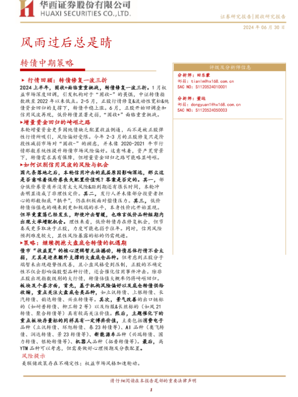 【华西证券】【20240630】转债中期策略:风雨过后总是晴-29页 行业研究