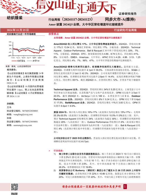 【山西证券】【20241125】纺织服装行业周报:Amer披露2024Q3业绩,大中华区营收增速环比继续提升-18页 行业研究