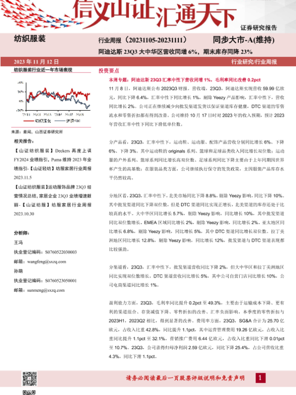 【山西证券】【20231112】纺织服装行业周报:阿迪达斯23Q3大中华区营收同增6%,期末库存同降23%-26页 行业研究