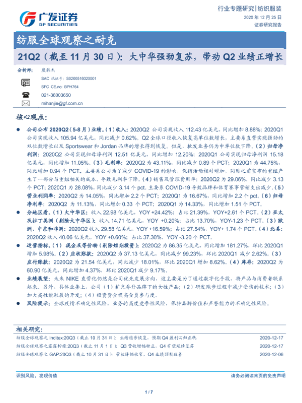 【广发证券】【20201225】纺服全球观察之耐克:21Q2(截至11月30日):大中华强劲复苏,带动Q2业绩正增长-7页 行业研究