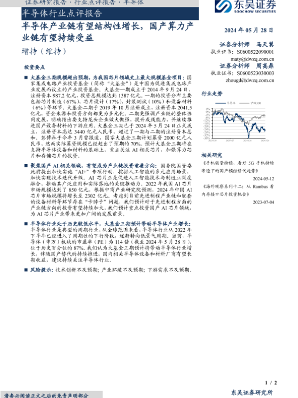 【东吴证券】【20240528】半导体产业链有望结构性增长,国产算力产业链有望持续受益-2页 行业研究