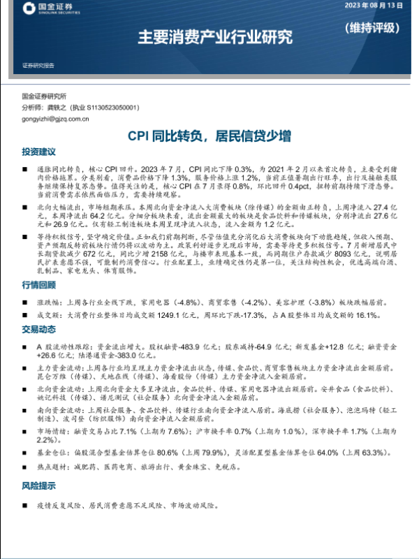 【国金证券】【20230813】主要消费行业产业行业研究:CPI同比转负,居民信贷少增-18页 行业研究