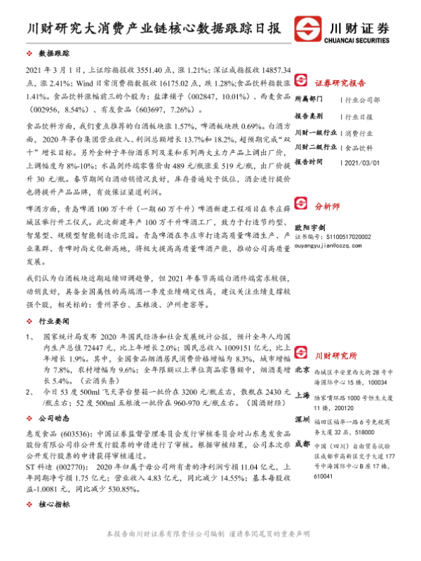 【川财证券】【20210301】食品饮料:川财研究大消费产业链核心数据跟踪日报-4页 行业研究
