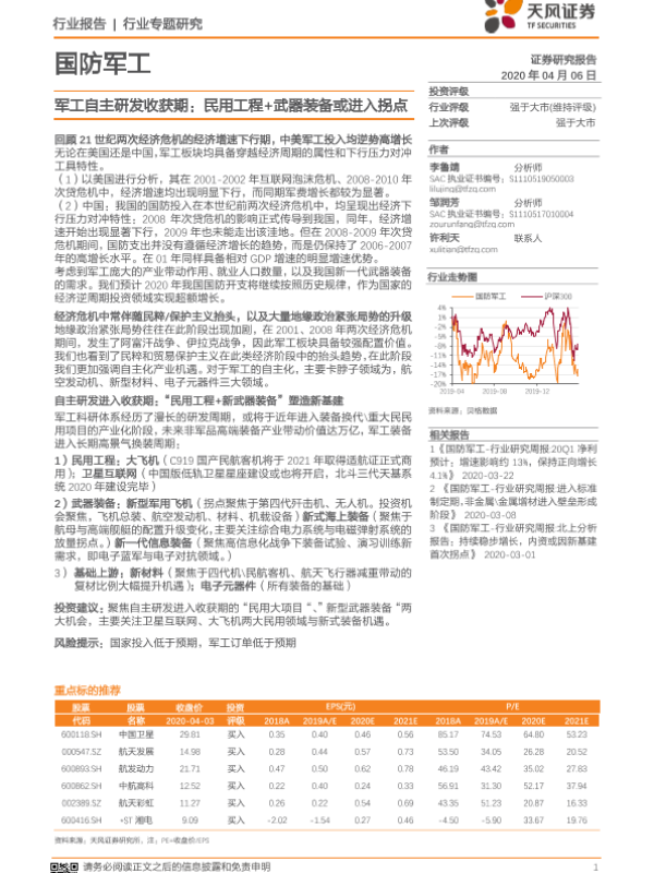 【天风证券】【20200406】国防军工行业专题研究:军工自主研发收获期:民用工程+武器装备或进入拐点-19页 行业研究