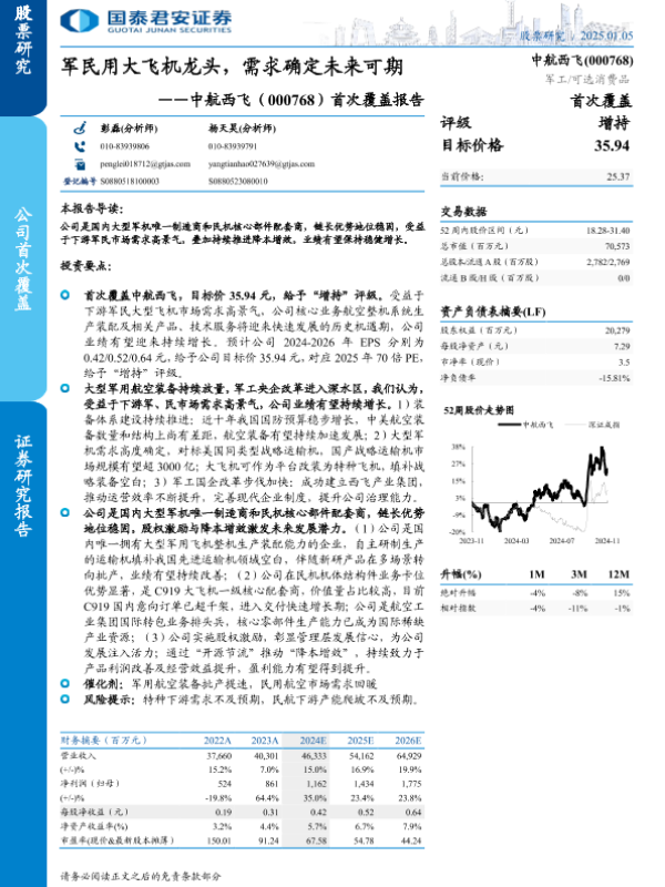 【国泰君安证券】【20250105】中航西飞(000768)首次覆盖报告:军民用大飞机龙头,需求确定未来可期-19页 行业研究