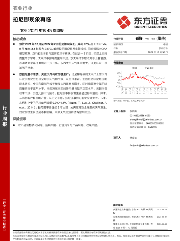 【东方证券】【20211030】农业2021年第45周周报:拉尼娜现象再临-8页 行业研究