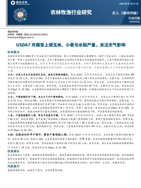 【国金证券】【20240717】农林牧渔行业月报:USDA7月报告上调玉米、小麦与水稻产量,关注天气影响-11页 行业研究