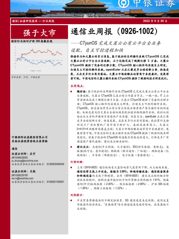 【中银证券】【20220926】通信业周报:CTyunOS完成天翼云公有云平台全业务适配,自主可控进程加快-23页 行业研究