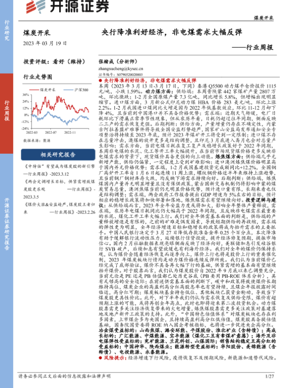 【开源证券】【20230319】煤炭开采行业周报:央行降准利好经济,非电煤需求大幅反弹-27页 行业研究