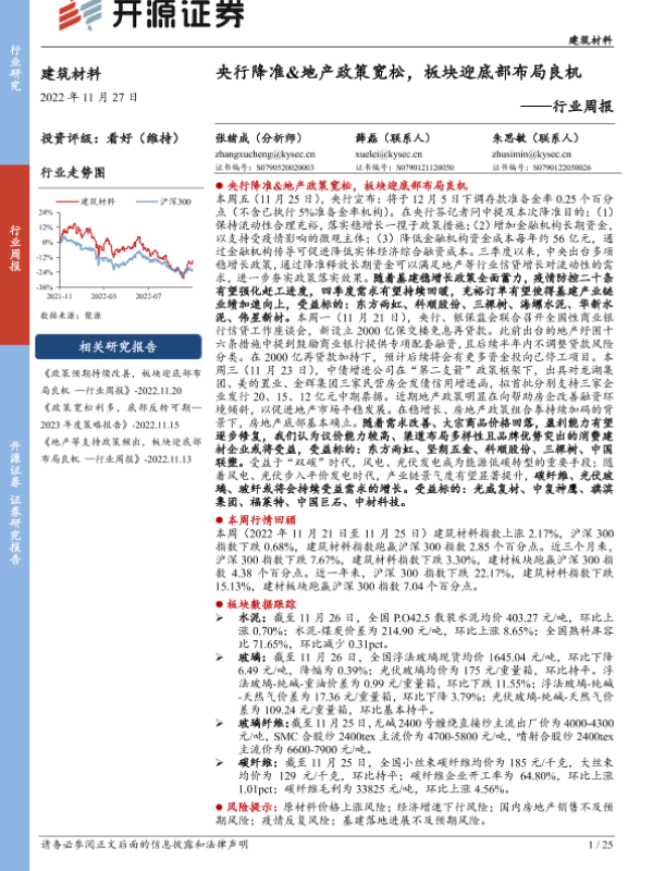【开源证券】【20221127】建筑材料行业周报:央行降准&地产政策宽松,板块迎底部布局良机-25页 行业研究