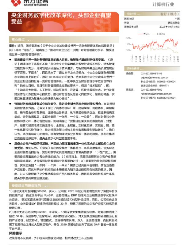 【东方证券】【20220303】计算机行业动态跟踪:央企财务数字化改革深化,头部企业有望受益-3页 行业研究