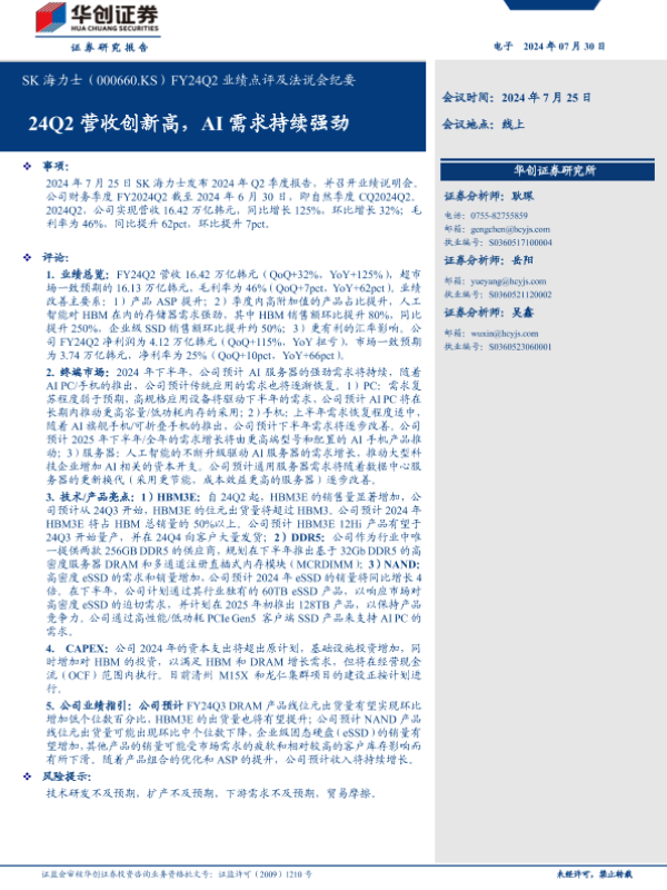 【华创证券】【20240730】SK海力士(000660)FY24Q2业绩点评及法说会纪要:24Q2营收创新高,AI需求持续强劲-14页 行业研究
