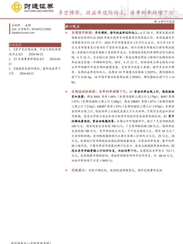 【财通证券】【20240428】固收定期报告:多空博弈,收益率边际向上,存单利率持续下行-17页 行业研究