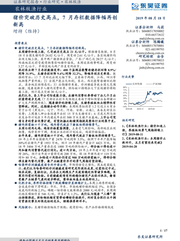 【东吴证券】【20190818】农林牧渔行业跟踪周报:猪价突破历史高点,7月存栏数据降幅再创新高-17页 行业研究