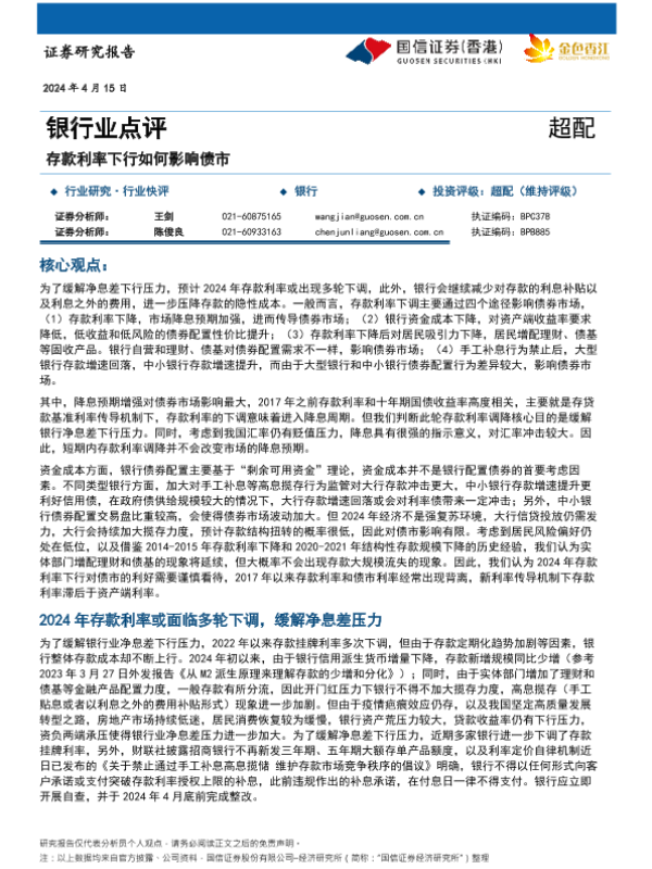 【国信证券(香港)】【20240415】银行业点评:存款利率下行如何影响债市-8页 行业研究