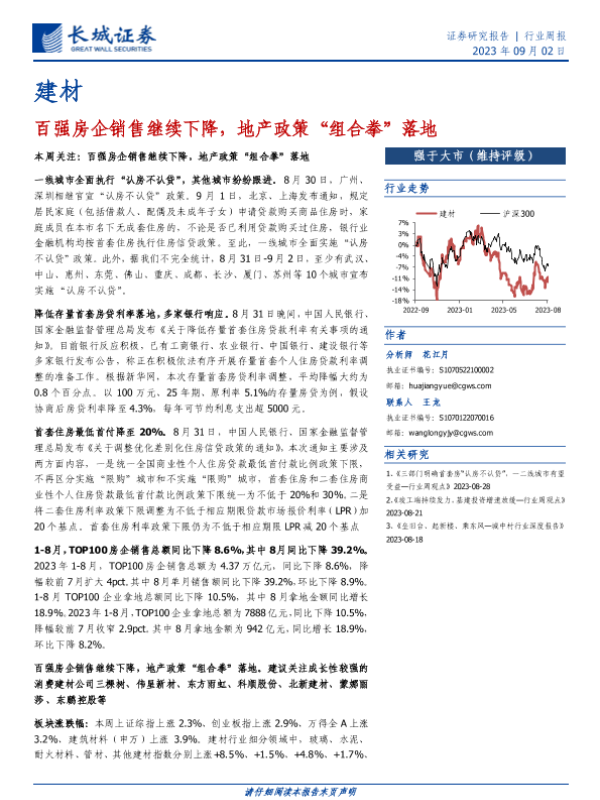 【长城证券】【20230902】建材行业周报:百强房企销售继续下降,地产政策“组合拳”落地-19页 行业研究