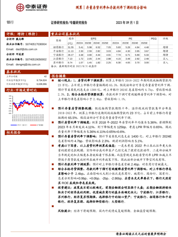 【中泰证券】【20230901】银行业:存量房贷利率和存款利率下调的综合影响-17页 行业研究