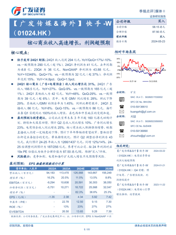 【广发证券】【20240523】快手-W(01024.HK)核心商业收入高速增长,利润超预期-11页 行业研究