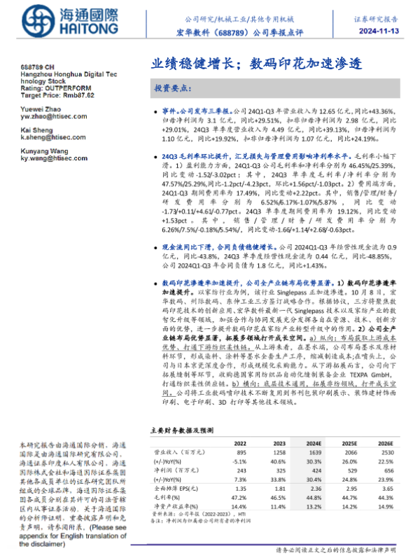 【海通国际】【20241113】宏华数科(688789)公司季报点评:业绩稳健增长;数码印花加速渗透-14页 行业研究