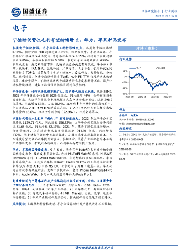 【国盛证券】【20220912】电子行业周报:宁德时代营收毛利有望持续增长,华为、苹果新品发布-17页 行业研究
