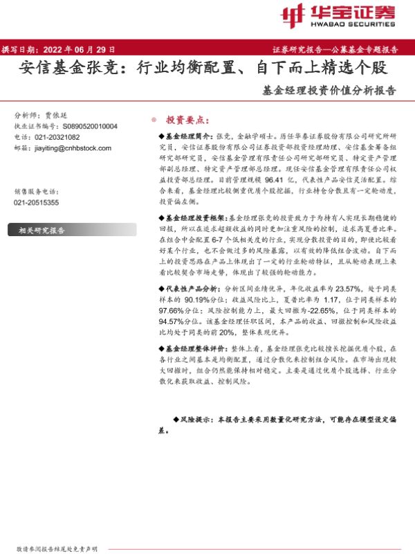 【华宝证券】【20220629】基金经理投资价值分析报告:安信基金张竞,行业均衡配置、自下而上精选个股-16页 行业研究