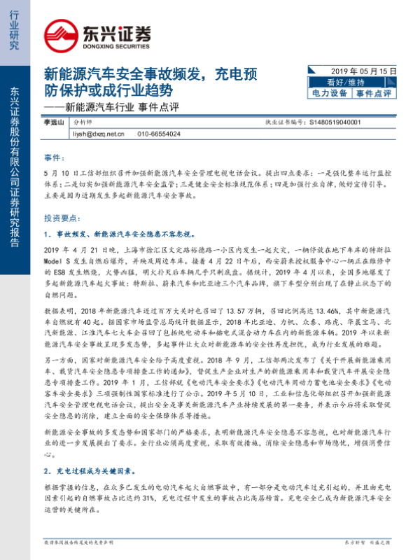 【东兴证券】【20190515】新能源汽车行业事件点评:新能源汽车安全事故频发,充电预防保护或成行业趋势-4页 行业研究