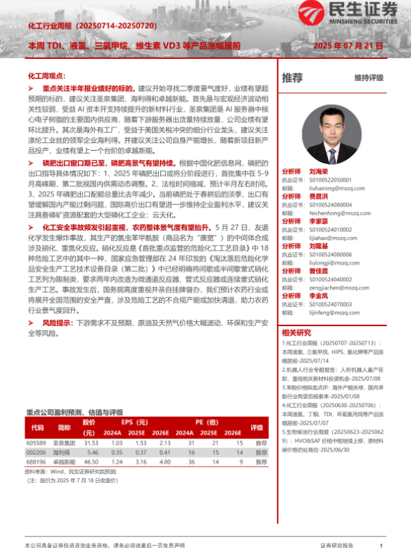 【民生证券】【20250721】化工行业周报:本周TDI、液氯、三氯甲烷、维生素VD3等产品涨幅居前-34页 证券期货研究报告