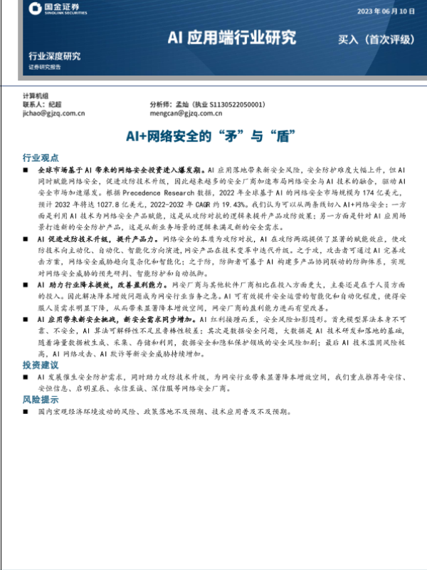 【国金证券】【20230610】AI应用端行业深度研究:AI+网络安全的“矛”与“盾”-20页 行业研究