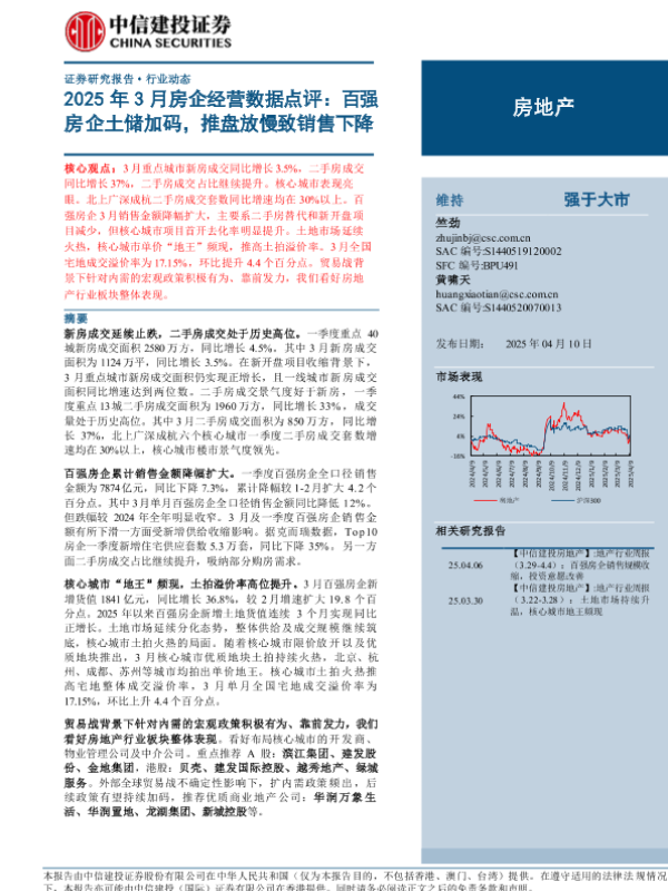 【中信建投证券】【20250410】2025年3月房企经营数据点评:百强房企土储加码,推盘放慢致销售下降-13页 证券期货研究报告
