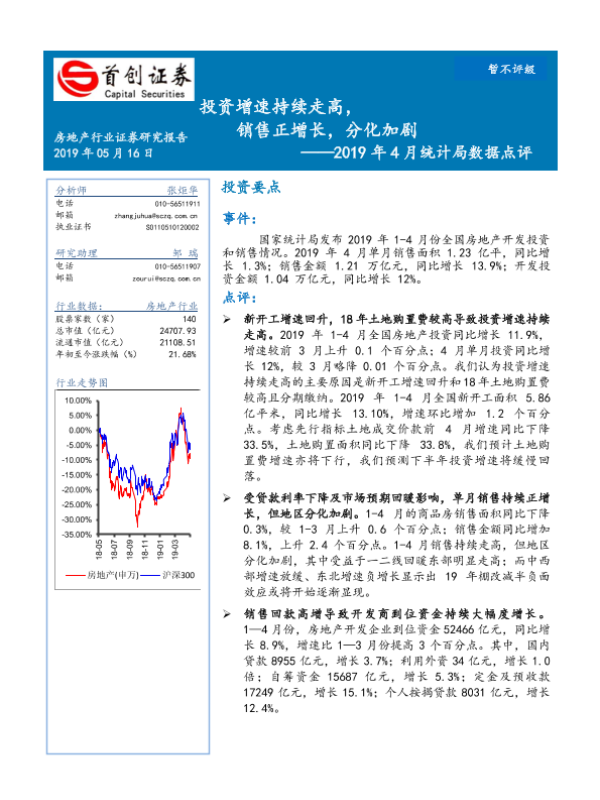 【首创证券】【20190516】2019年4月统计局数据点评:投资增速持续走高,销售正增长,分化加剧-3页 行业研究