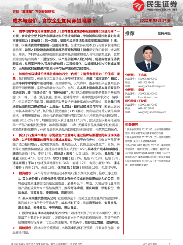 【民生证券】【20220517】食品饮料行业寻找“高质量”系列专题研究:成本与定价,食饮企业如何穿越周期?-39页 行业研究