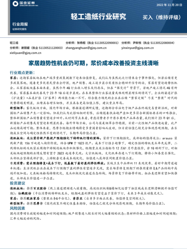 【国金证券】【20221120】20221120-国金证券-轻工造纸行业周报:家居趋势性机会仍可期,浆价成本改善投资主线清晰-18页 行业研究