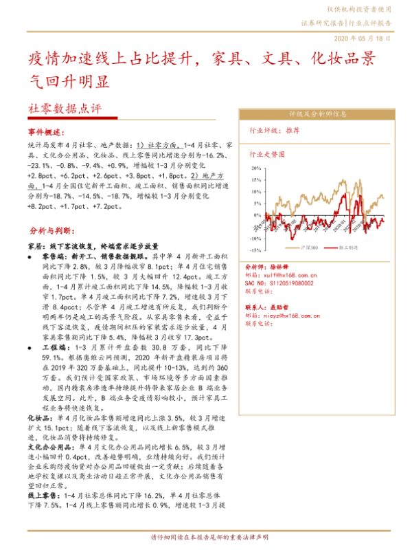 【华西证券】【20200518】社零数据点评:疫情加速线上占比提升,家具、文具、化妆品景气回升明显-7页 行业研究