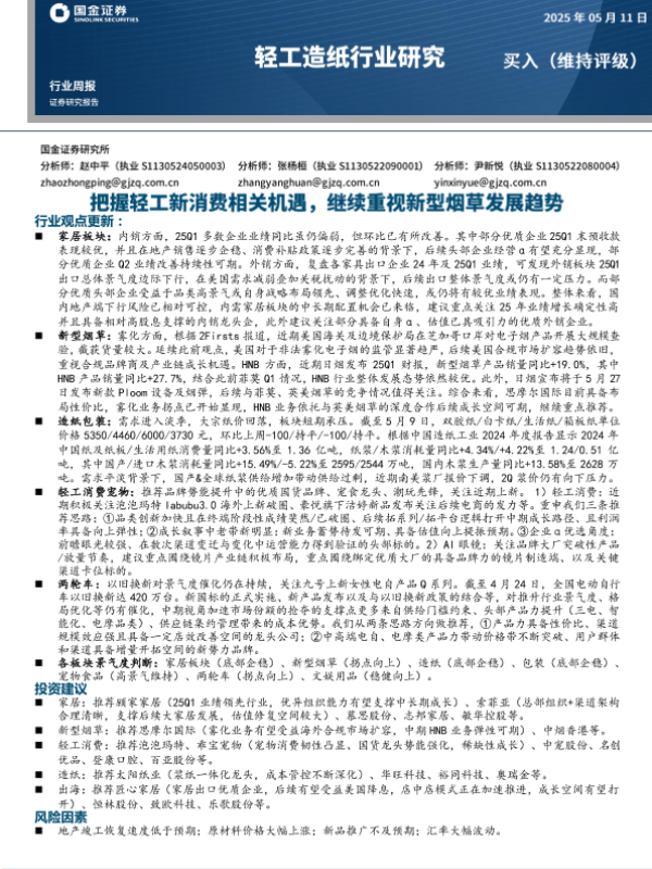 【国金证券】【20250511】轻工造纸行业研究:把握轻工新消费相关机遇,继续重视新型烟草发展趋势-17页 行业研究