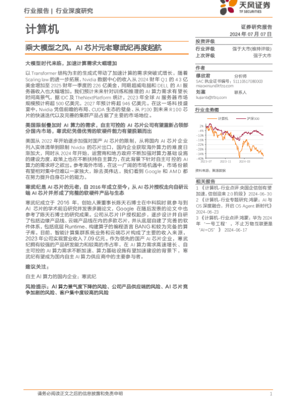 【天风证券】【20240707】计算机行业报告:乘大模型之风,AI芯片元老寒武纪再度起航-30页 行业研究