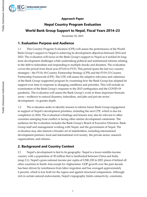 【世界银行集团】【20231130】世界银行-尼泊尔国家方案评估:世界银行集团对尼泊尔的支持,2014-2023财政年度(方法文件)-32页 行业研究