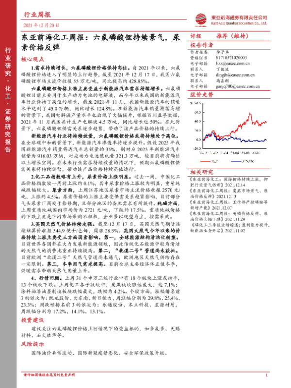 【东亚前海证券】【20211220】东亚前海化工周报:六氟磷酸锂持续景气,尿素价格反弹-20页 行业研究