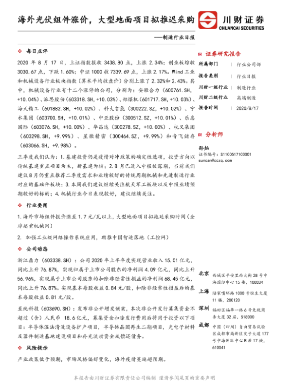 【川财证券】【20200817】制造行业日报:海外光伏组件涨价,大型地面项目拟推迟采购-2页 证券期货研究报告