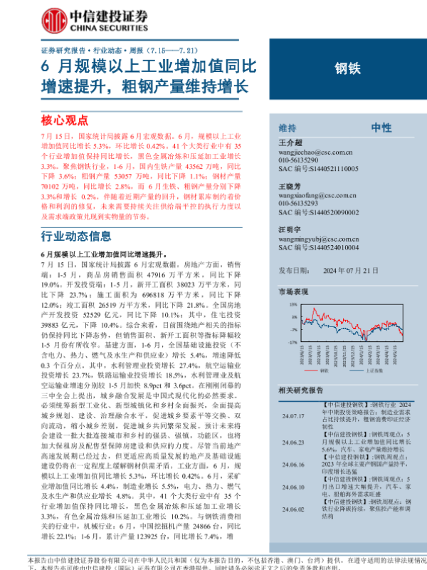 【中信建投证券】【20240721】钢铁行业:6月规模以上工业增加值同比增速提升,粗钢产量维持增长-26页 行业研究
