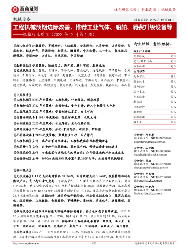 【浙商证券】【20221204】机械行业周报(2022年12月第1周):工程机械预期边际改善,推荐工业气体、船舶、消费升级设备等-22页 行业研究
