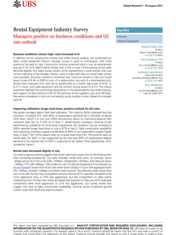 【瑞银】【20210818】瑞银-美股工业设备行业-管理者们对业务状况和第三季度利率前景持乐观态度-25页 行业研究