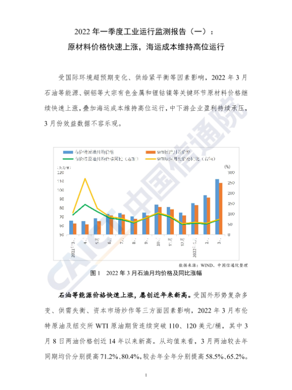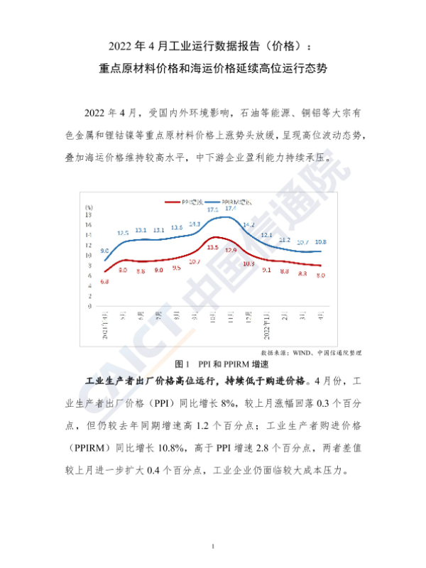 【中国信通院】【2022】2022年4月工业运行数据报告(价格):重点原材料价格和海运价格延续高位运行态势-7页 行业研究