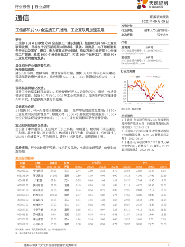 【天风证券】【20220909】通信行业点评:工信部印发5G全连接工厂指南,工业互联网加速发展-5页 行业研究
