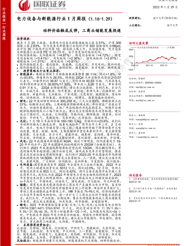 【国联证券】【20230129】电力设备与新能源行业1月周报:硅料价格触底反弹,工商业储能发展提速-20页 行业研究